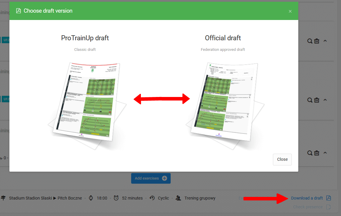 PDF გეგმის ჩამოსატვირთად, დააჭირეთ ღილაკს "გეგმის ჩამოტვირთვა", რომელიც მდებარეობს შერჩეული ვარჯიშის ქვეშ ჩანართში დღიური ვარჯიშები განრიგი. შემდეგ აირჩიეთ გეგმის შაბლონი, რომლის ჩამოტვირთვაც გსურთ თქვენს კომპიუტერში.