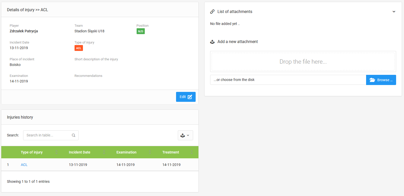 Каждая травма имеет свой собственный файл, в котором доступны все детали события. Здесь вы сможете добавить в качестве файла файл, содержащий, например, выписку из больницы или рентген.